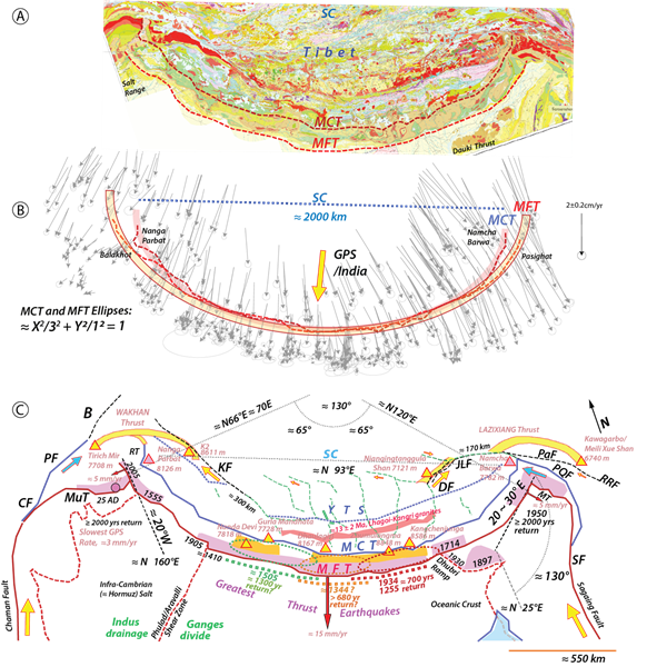 (A和B:喜马拉雅山脉主冲断层MCT和MFT以及印度/亚洲雅卢藏布江缝合带以南以及南迦帕尔巴特峰和南迦巴瓦峰之间的构造弧形;C:北印度/南西藏大规模断层活动)