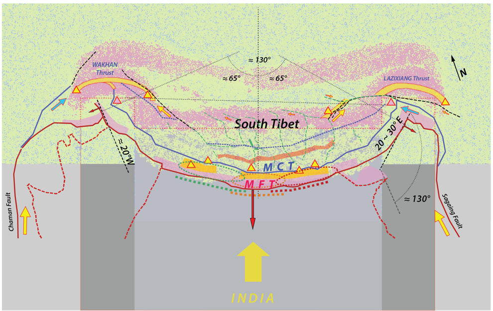 喜马拉雅山脉傲居世界之颠,由一众高于7000米山峰构成长达2500km山链,珠穆朗玛峰海拔8848米屹立其列,俯视其呈现向南凸出的近乎完美的半个椭圆弧形,宛如一张拉满的“天弓”,构成地球上一道靓丽风景线,吸引了科学家好奇和探索欲望。但是喜马拉雅弧形山脉的成因、与印度板块与亚欧板块碰撞的关系、及其几何形状对沿喜马拉雅山前碰撞带速率与弧前碰撞带大地震周期的影响机制等,一直是地学研究的热点问题。