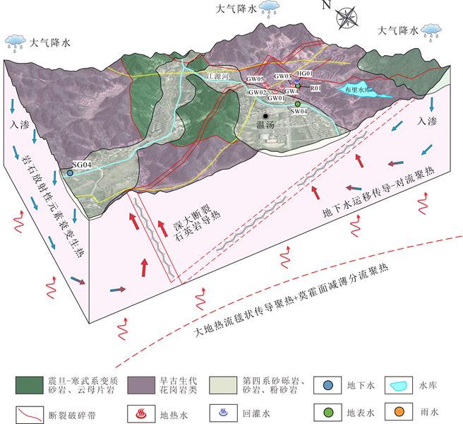 中国地热资源以中低温水热型为主,广泛分布于东南沿海与华南造山带。其中万龙山地热系统成因复杂,深部循环路径与热储结构长期处于“黑箱”状态,严重制约了地热资源的精准勘探与可持续开发。为揭示温汤地热田的成因,研究团队系统采集了12组水样(包括地热水、地表水、地下水、雨水及回灌水),综合运用地质构造分析、水化学图解H-O-Sr稳定同位素示踪等手段,开展了深入探究。研究结果表明地热田的地热水与冷水均起源于大气降水。地热水沿断裂带径流时经历了强烈的水-岩相互作用,并在上升过程中与浅层冷水发生混合,混合比例达72%-83%,估算深部热储温度介于92.5℃-101.1℃。水化学特征显示其为中低温、弱碱性的HCO3-Na型水,由深部水-岩作用与浅部混合过程共同控制。万龙山断裂作为NE向深大断裂,其深部的高渗透低阻异常为上地幔热流上涌提供了“主动脉”;其次生断裂与破碎系统则构成了裂隙-孔隙复合型热储。