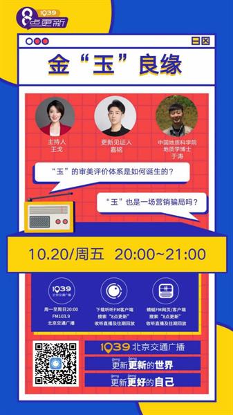2023年10月20日晚8点,北京交通广播邀请中国地质科学院于涛博士走进《8点更新》栏目,与主持人一起为听众科普玉石相关科学知识,提高听众品鉴能力,并针对听众感兴趣的话题,实时互动为听众答疑解惑。