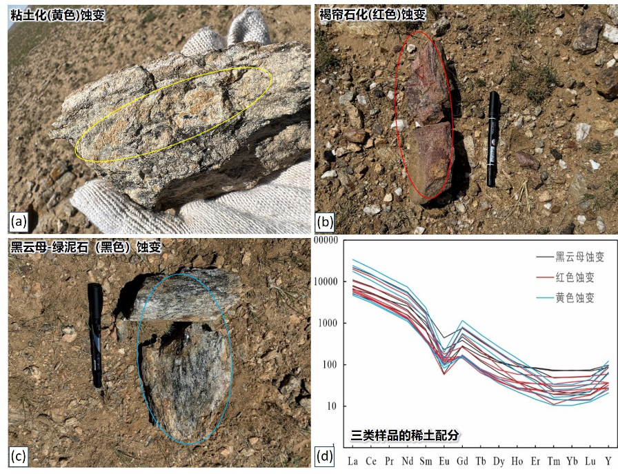 图1 巴彦淖尔地区矿化带中主要蚀变类型及其矿石稀土配分曲线
