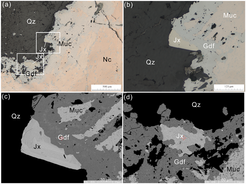 金秀矿(Jx)的反射光及背散射电子图像;Nc-红砷镍矿;Muc-砷镍矿;Gdf-辉砷镍矿;Qz-石英
