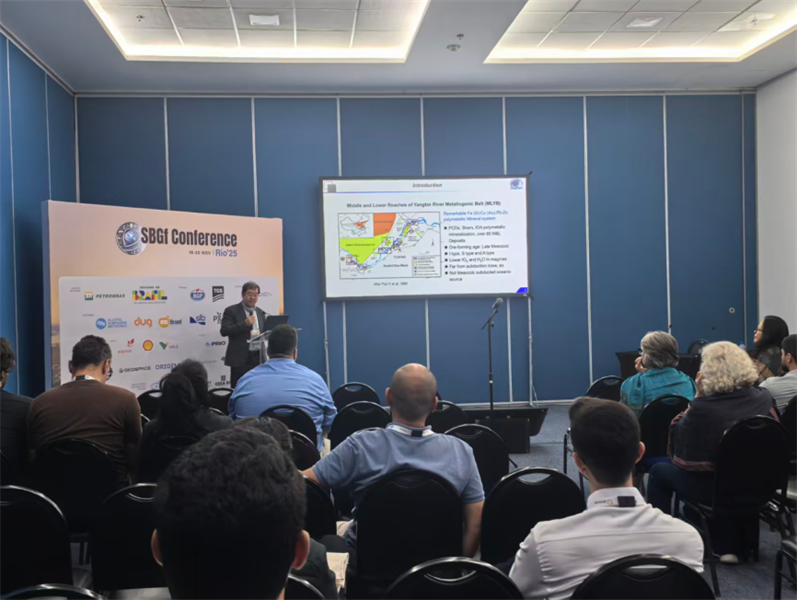 出访期间,代表团积极参与了在里约热内卢举办的第19届巴西地球物理国际研讨会。本次会议汇集了来自巴西及南美国家的2000余名学者与业界专家。吕庆田研究员应邀担任“矿产地球物理”专题召集人,并作了题为“综合地球物理探测揭示中国东部大型Fe-Cu成矿系统成因”的学术报告,系统分享了中国地质科学院在长江中下游成矿带长达二十年的综合探测研究成果,其多尺度、多参数的探测思路与方法引起了与会巴西专家的浓厚兴趣和热烈讨论。张昆研究员主持了“电磁方法:处理、反演与应用”专题会议,并报告了关于深部流体对青藏高原裂谷发育控制作用的最新研究成果,展示了我院在大地电磁阵列探测与深部电性结构研究方面的技术实力,获得了国际同行的关注与好评。