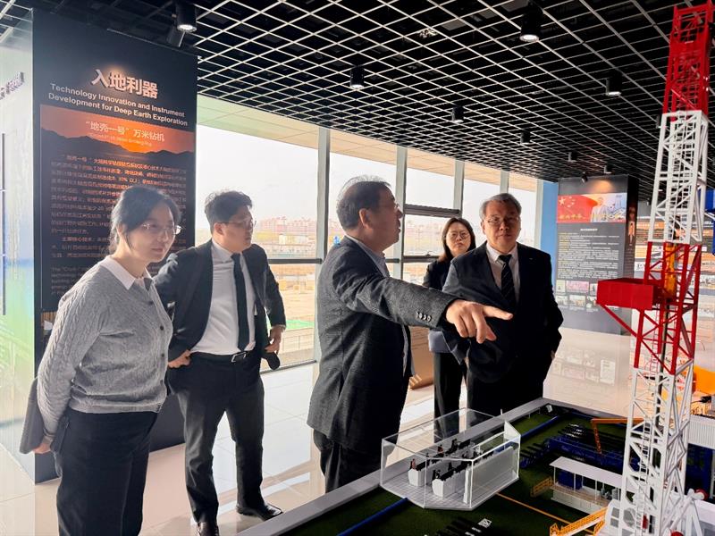 当日上午,韩国代表团首先前往中国地质科学院北清路新基地,参观深地探测与矿产勘查全国重点实验室成果展。在深地探测与矿产勘查全国重点实验室副主任吕庆田研究员陪同下,代表团系统了解了我国在深地探测、矿产资源勘查等领域的最新进展及标志性成果。