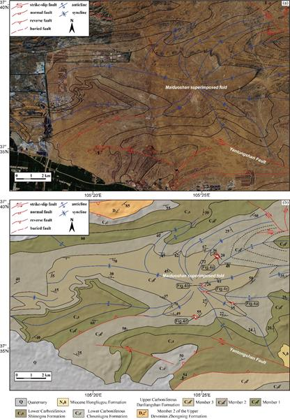 1.麦垛山叠加褶皱是由两个异时构造事件叠加形成。中晚三叠世,上石炭统单梁山组(C2d)在南北向挤压作用下形成了东西向的紧闭褶皱。上新世至第四纪期间,烟筒山走滑断层的左行单剪导致中晚三叠世形成的东西向紧密褶皱重褶。
