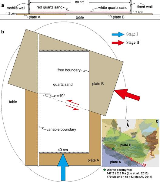 2.构造物理模拟实验结果表明,麦垛山西北部可能存在障碍物。我们推测在麦垛山西北部的金场子-二人山地区,中侏罗世至早白垩世早期形成的隐伏岩体阻碍了拖曳褶皱(由上新世至第四纪烟筒山走滑断层的左行单剪形成)向西北方向的移动。